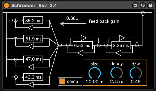 There are two main types of Schroeder reverb, but it reproduces the well-known combination of comb and all-pass filters. This is not a very good reverb. However, it is one of the earliest forms of digital reverb and is of great historical importance. This sound is very simple and gentle. It has a very lofi sound compared to modern rich reverbs, but it has a unique resonance.This algorithmic reverb is not often seen in plugins.